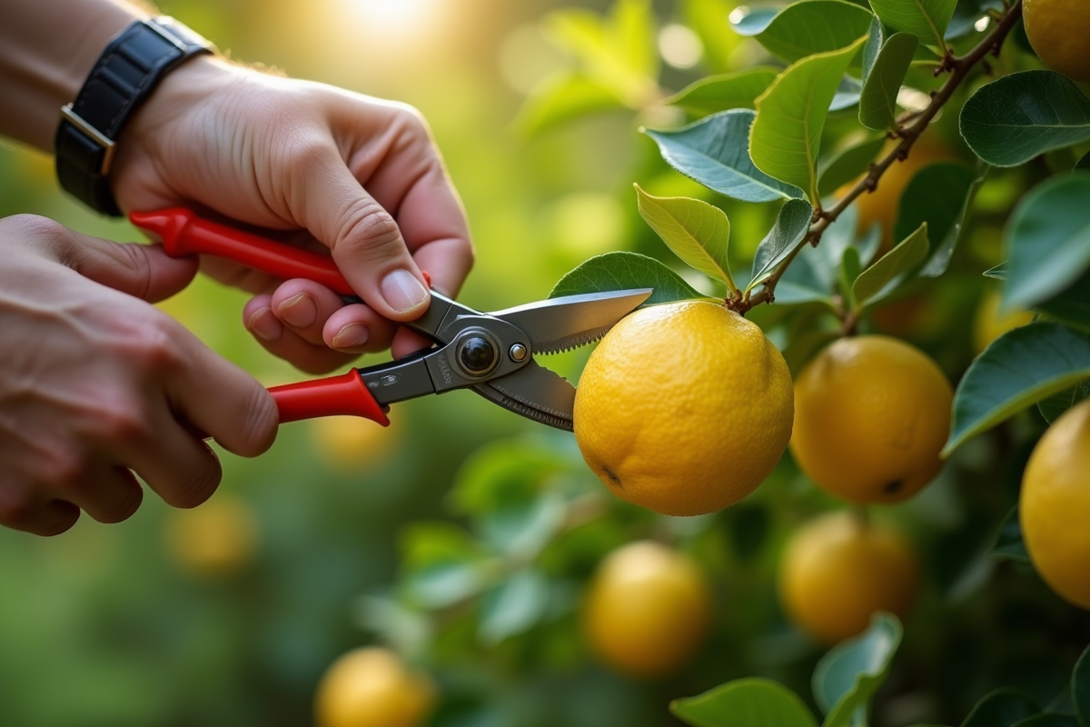 Pas de taille radicale sur un jeune Citrus limon. Une taille douce stimule la ramification, sans épuiser l’arbre. Pour chaque coupe, ciblez juste au-dessus d’un bourgeon tourné vers l’extérieur : ce geste guide la pousse et évite une forme trop compacte.